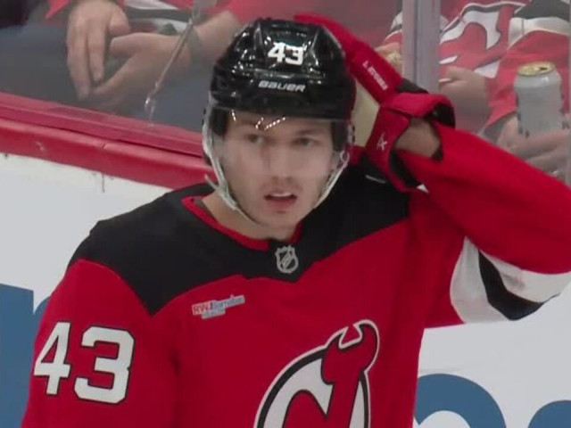 Watch as New Jersey Devils defenceman Luke Hughes puts the puck into his own net during the first period, with Hurricanes forward Nikolaj Ehlers getting credit, before having the puck poked off his stick and into the net by Taylor Hall in second.